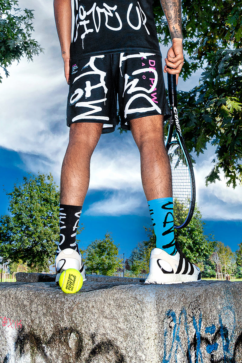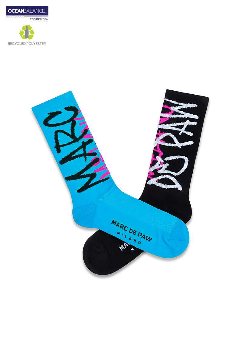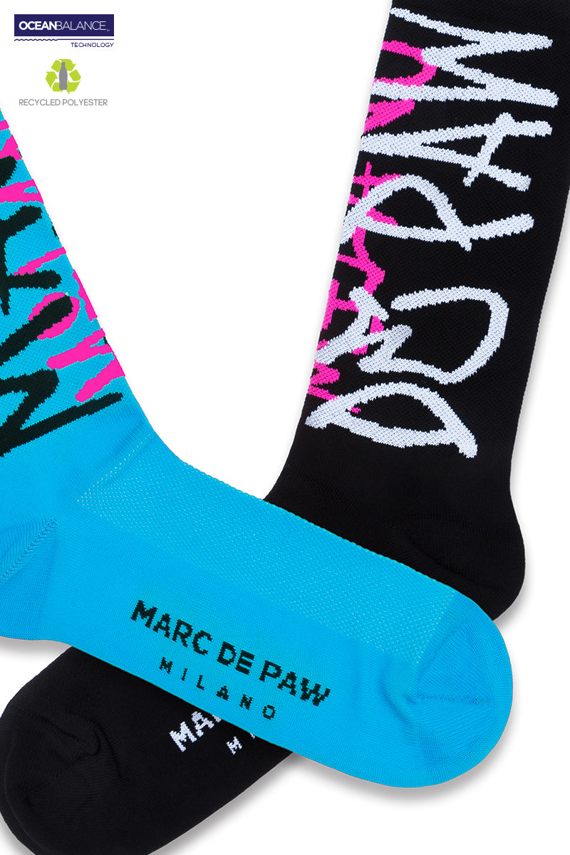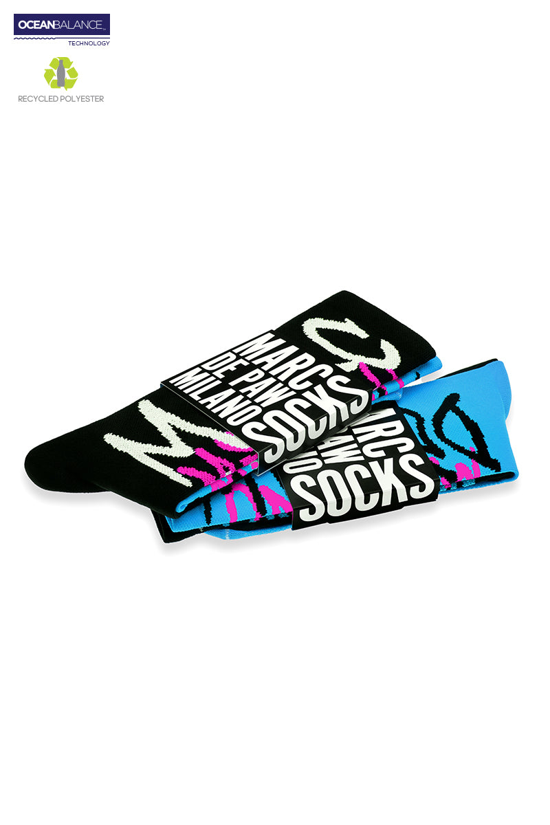 2 pairs of Black & Cyan Recycled active Socks with MARC DE PAW MILANO Spray lettering and logo.