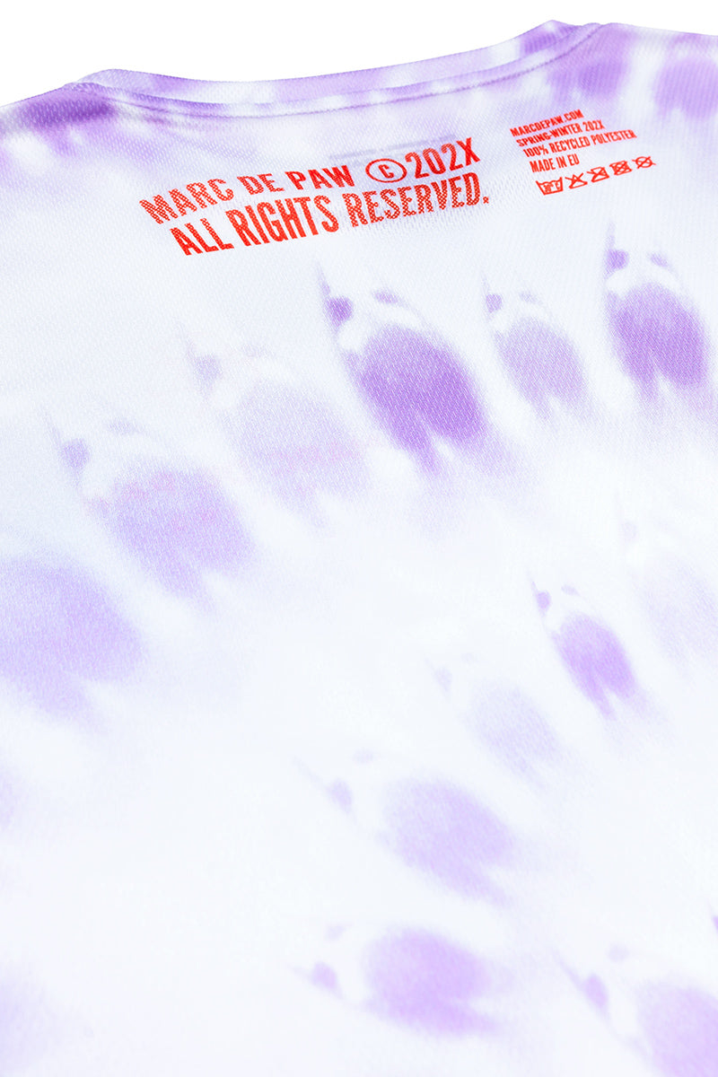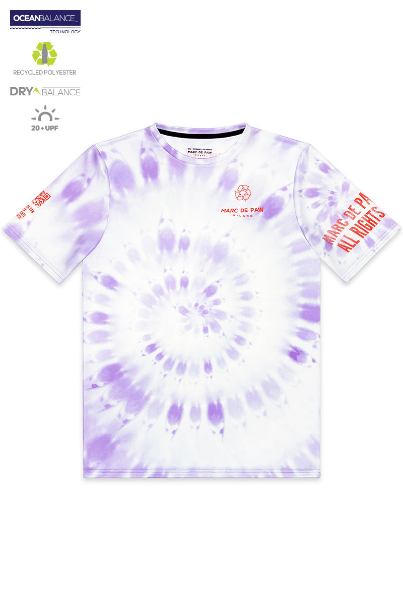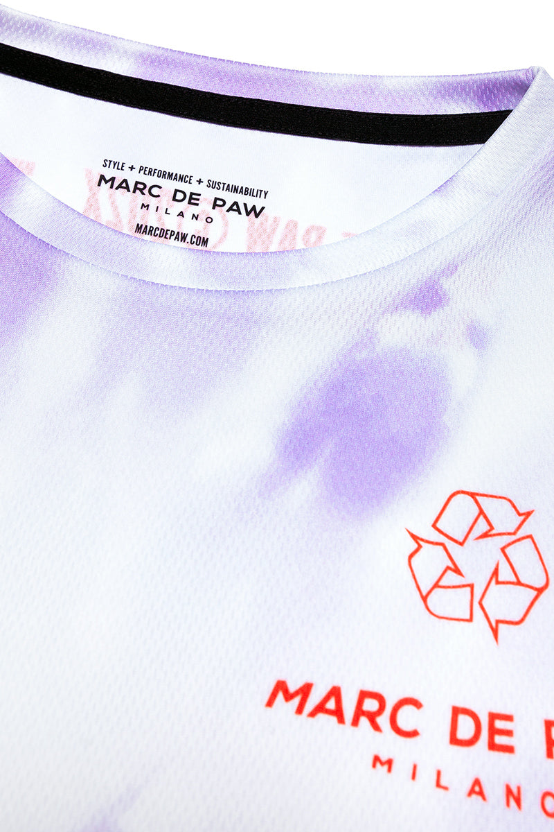 White and lavander Tie-Dye inspired abstract Design with orange MDP logo and graphics.