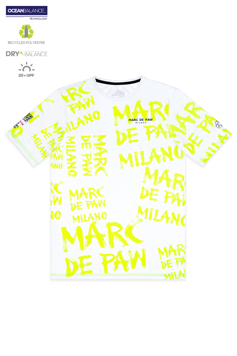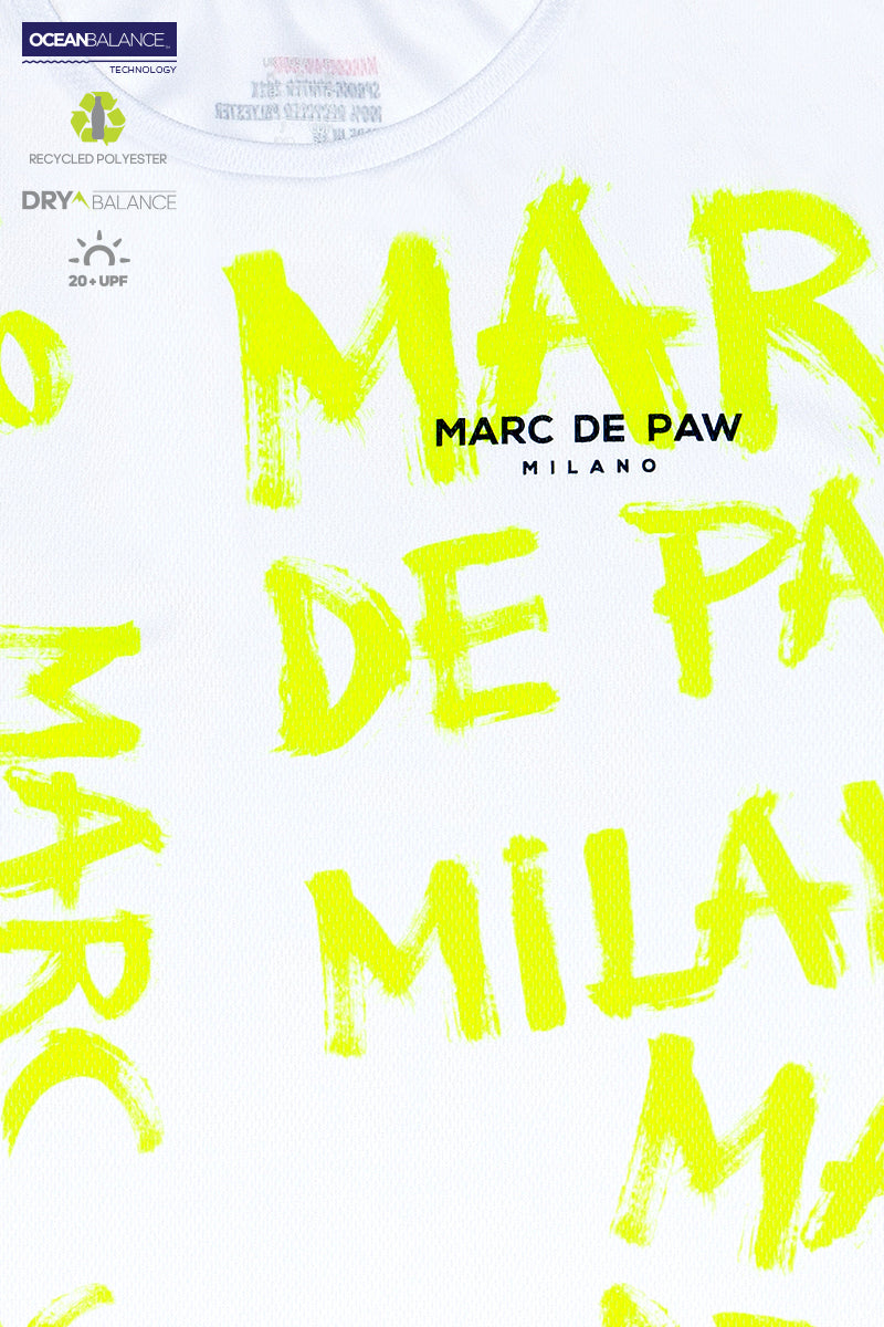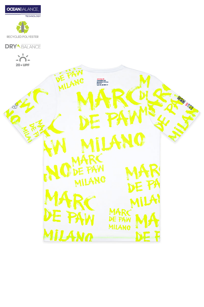 White Tennis T-Shirt with allover Neon Yellow brushed Marc De Paw logo.