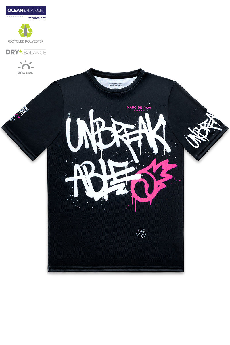 Black Tennis, Padel & Pickleball T-Shirt showcasing spray-graffiti inspired lettering: ‘Unbreakable’.
