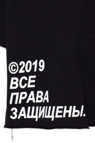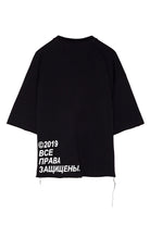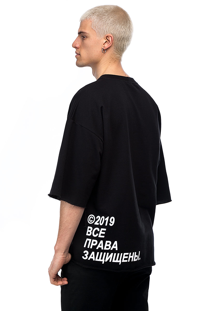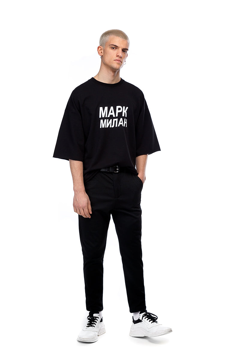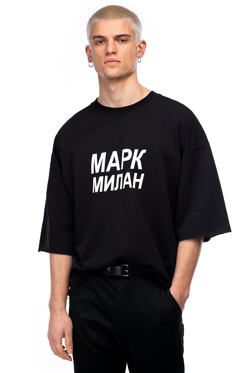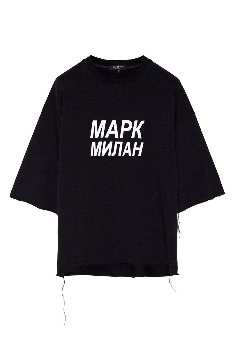Black cotton T-Shirt with "Марк Милан" lettering flocked at front and Copyright notice in russian language flocked at back.