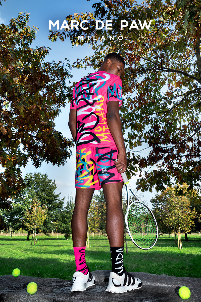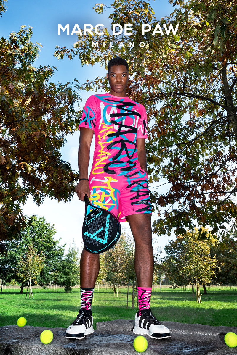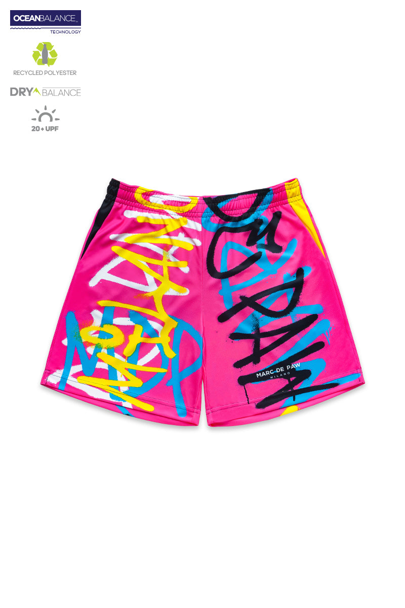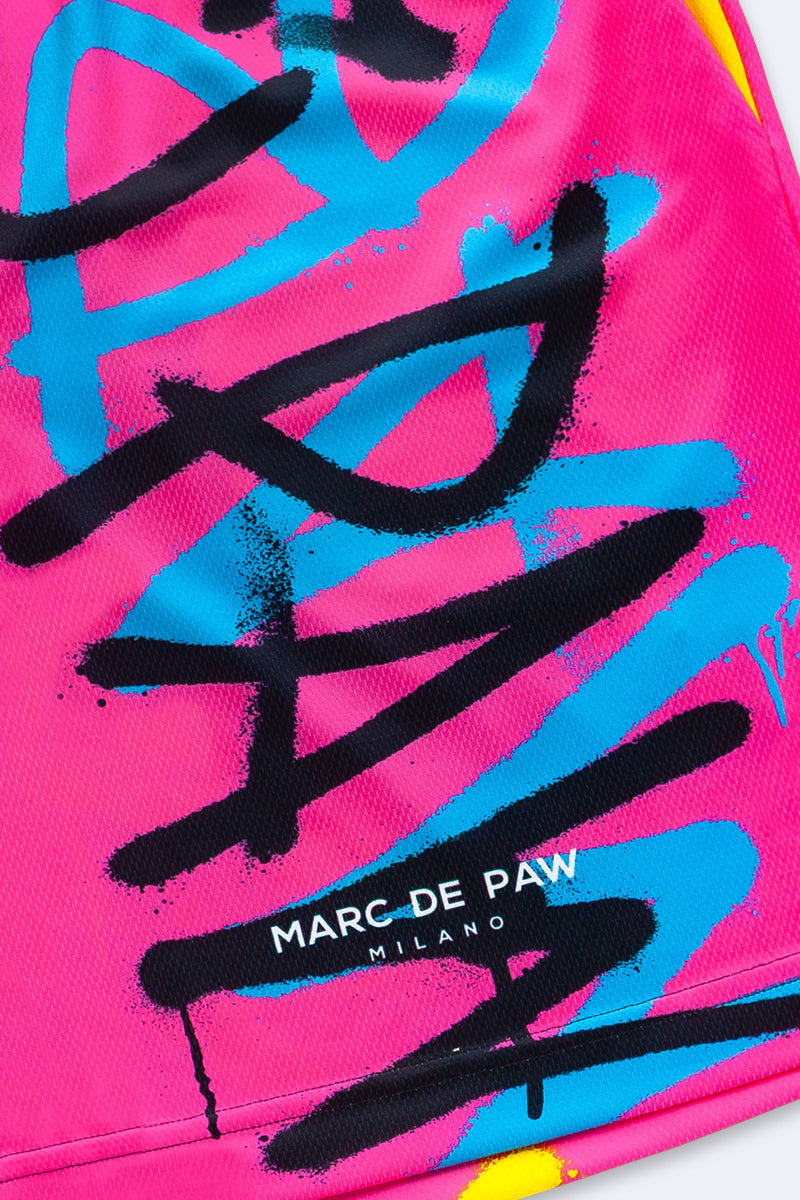 Neon pink Tennis, Padel & Pickleball Shorts with Multicolor MARC DE PAW MILANO Spray Lettering allover.
