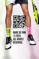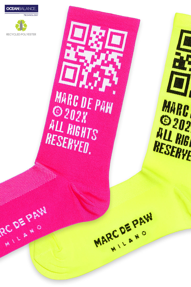 2 pairs of Neon Yellow & Neon Pink Recycled active Socks with MARC DE PAW QR code and Copyright notice.