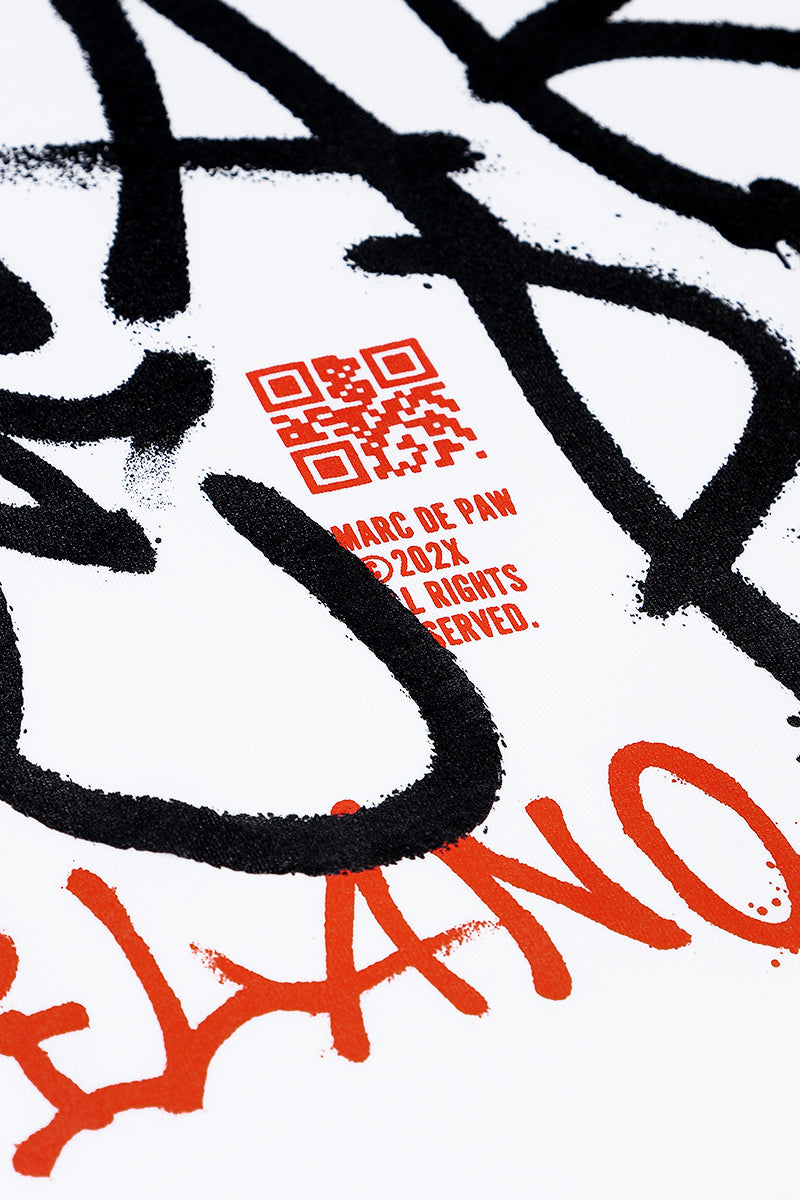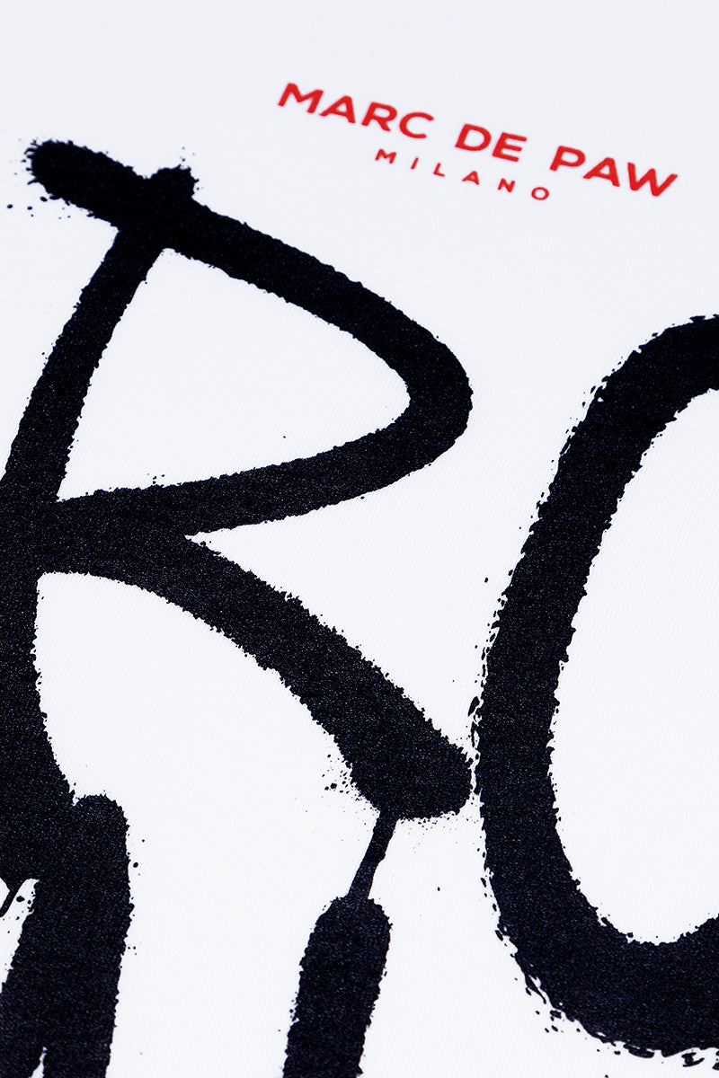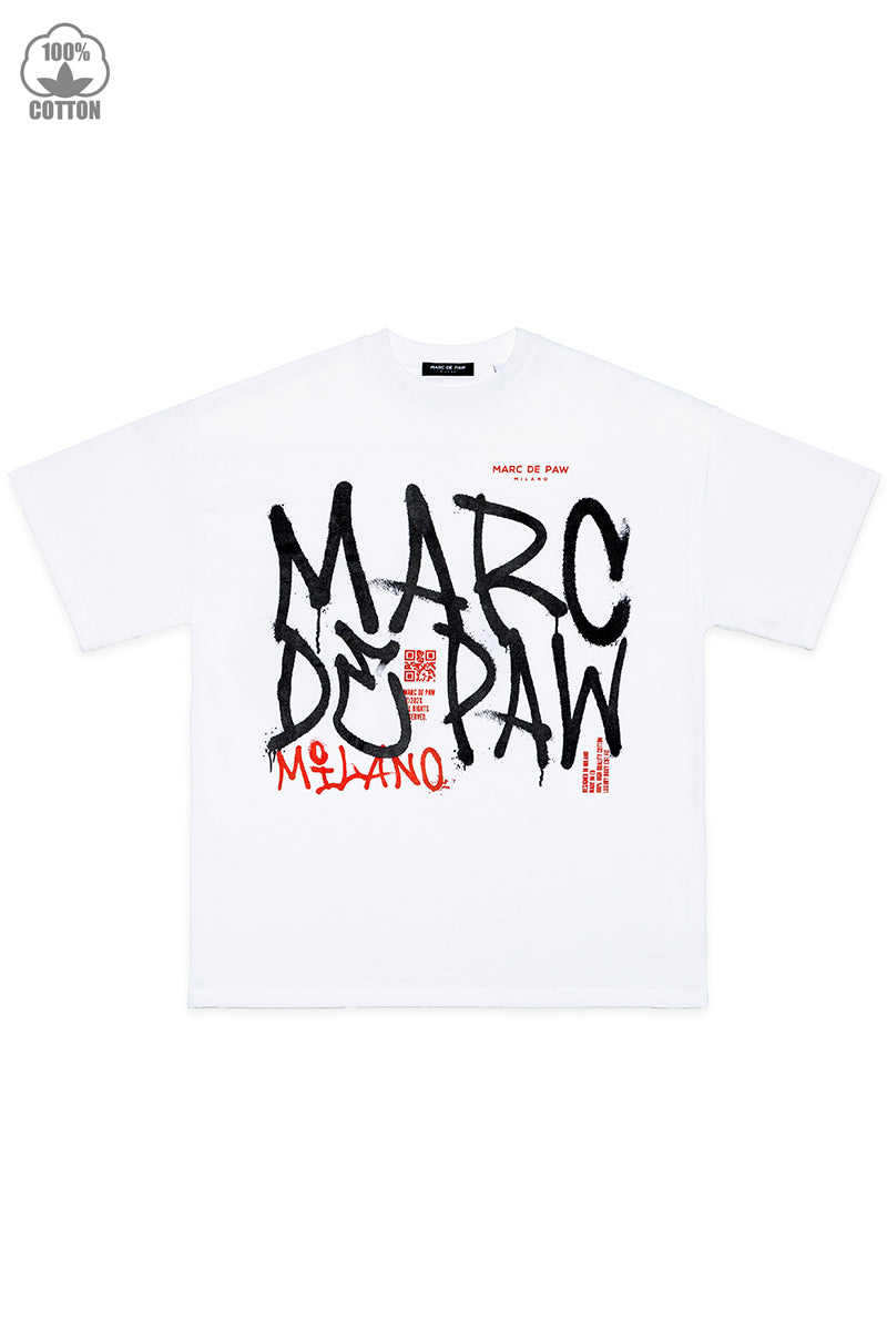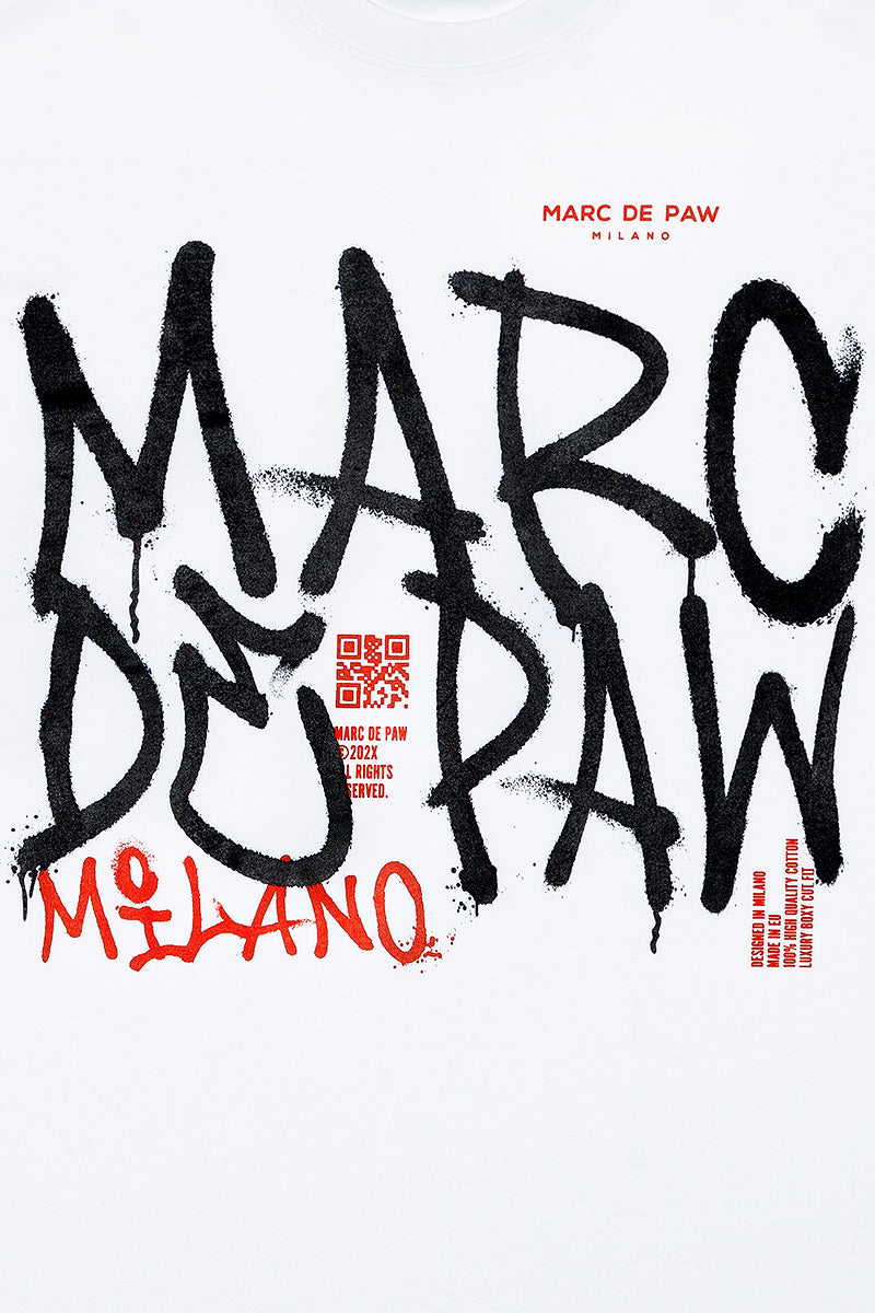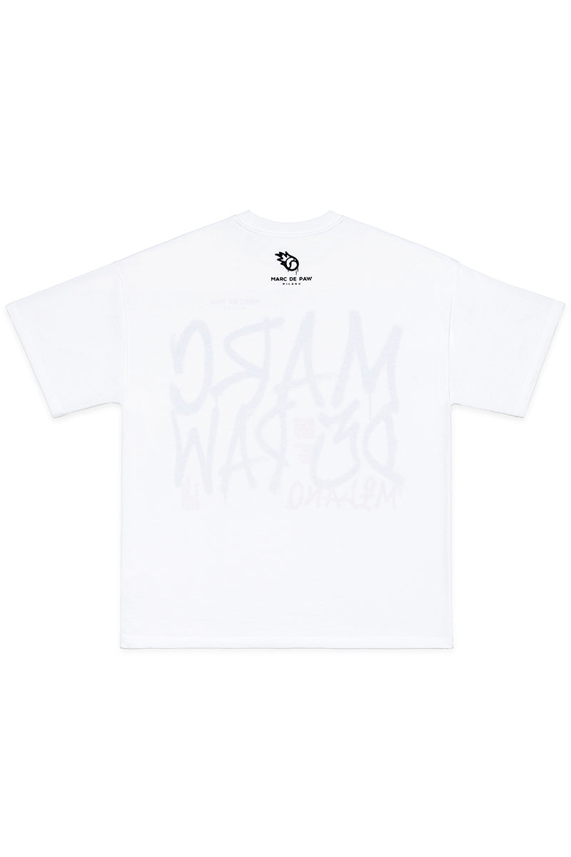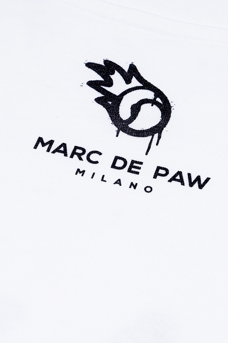 White 100% cotton T-shirt with Spray style MARC DE PAW MILANO logo silkscreen printed at front. FIRE BALL logo printed at back.