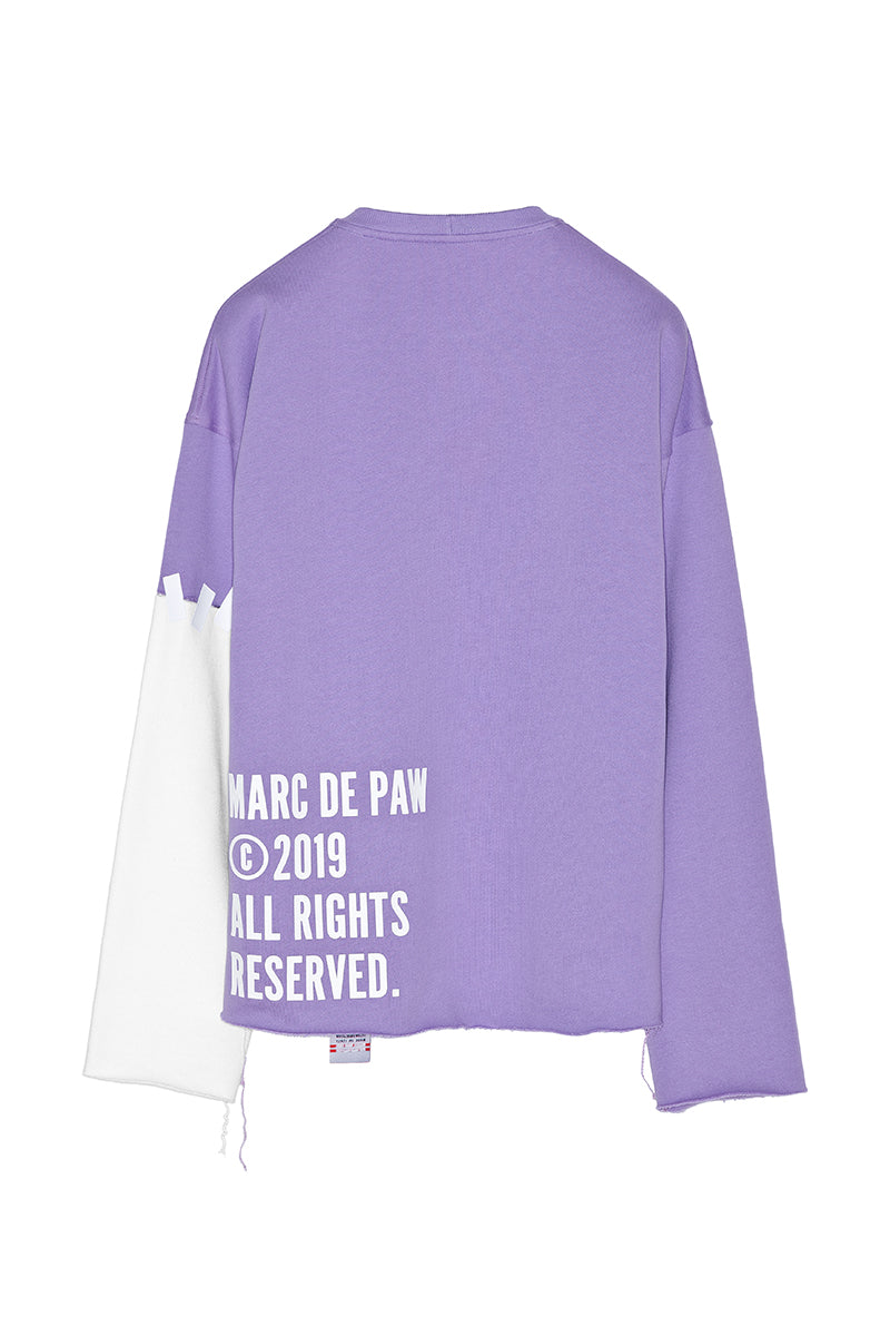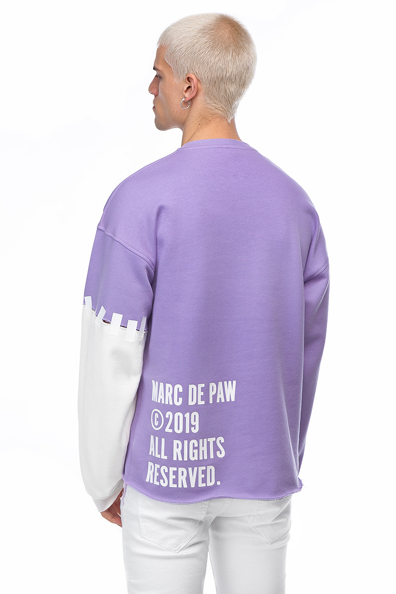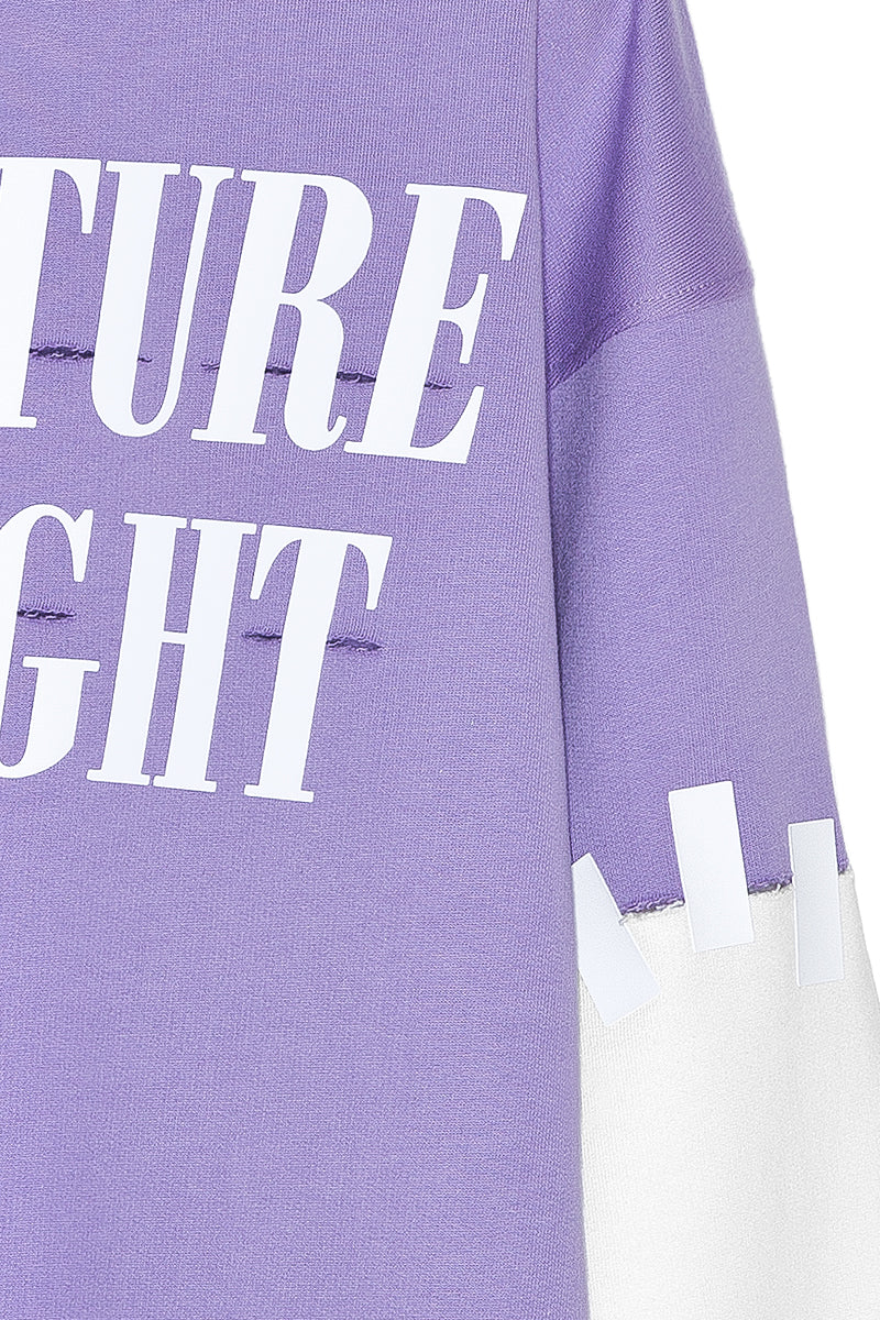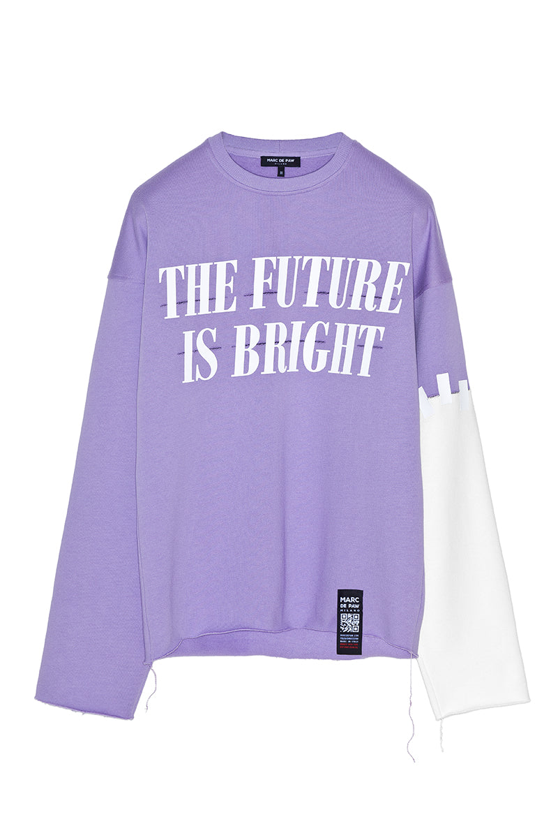 Lavander cotton Sweatshirt with THE FUTURE IS BRIGHT special application and ripped cuts at front, Copyright notice application at back and white contrast sleeve fixed with a special application.