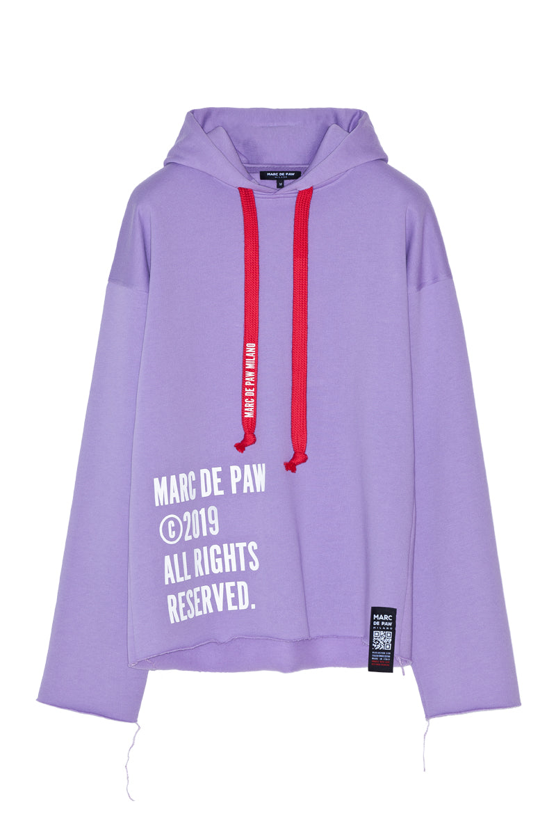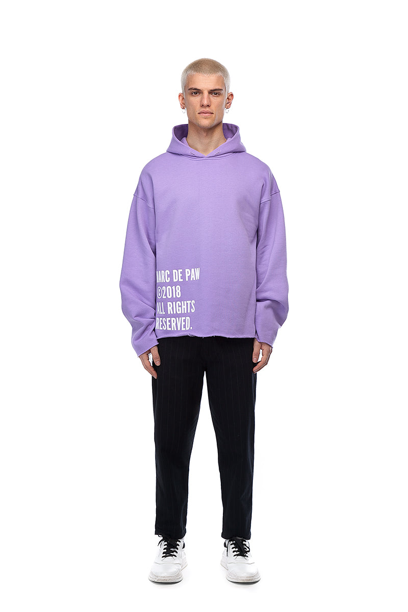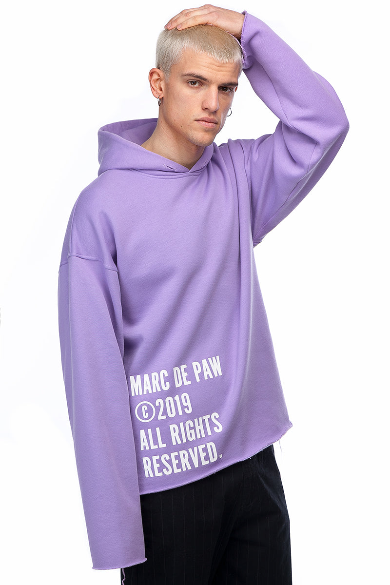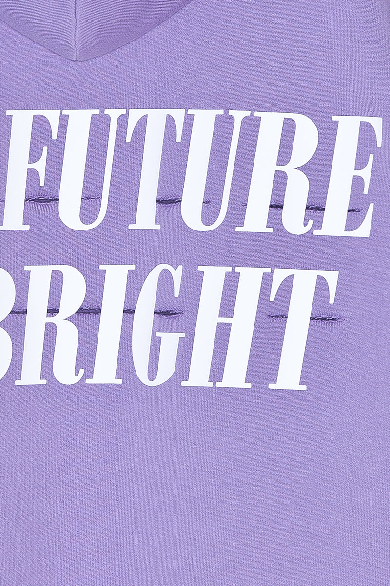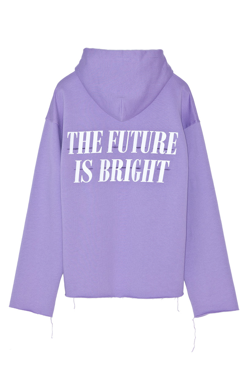 Lavander cotton Hoodie with Copyright notice application at front, THE FUTURE IS BRIGHT special application and ripped cuts at back and oversized printed drawstring.