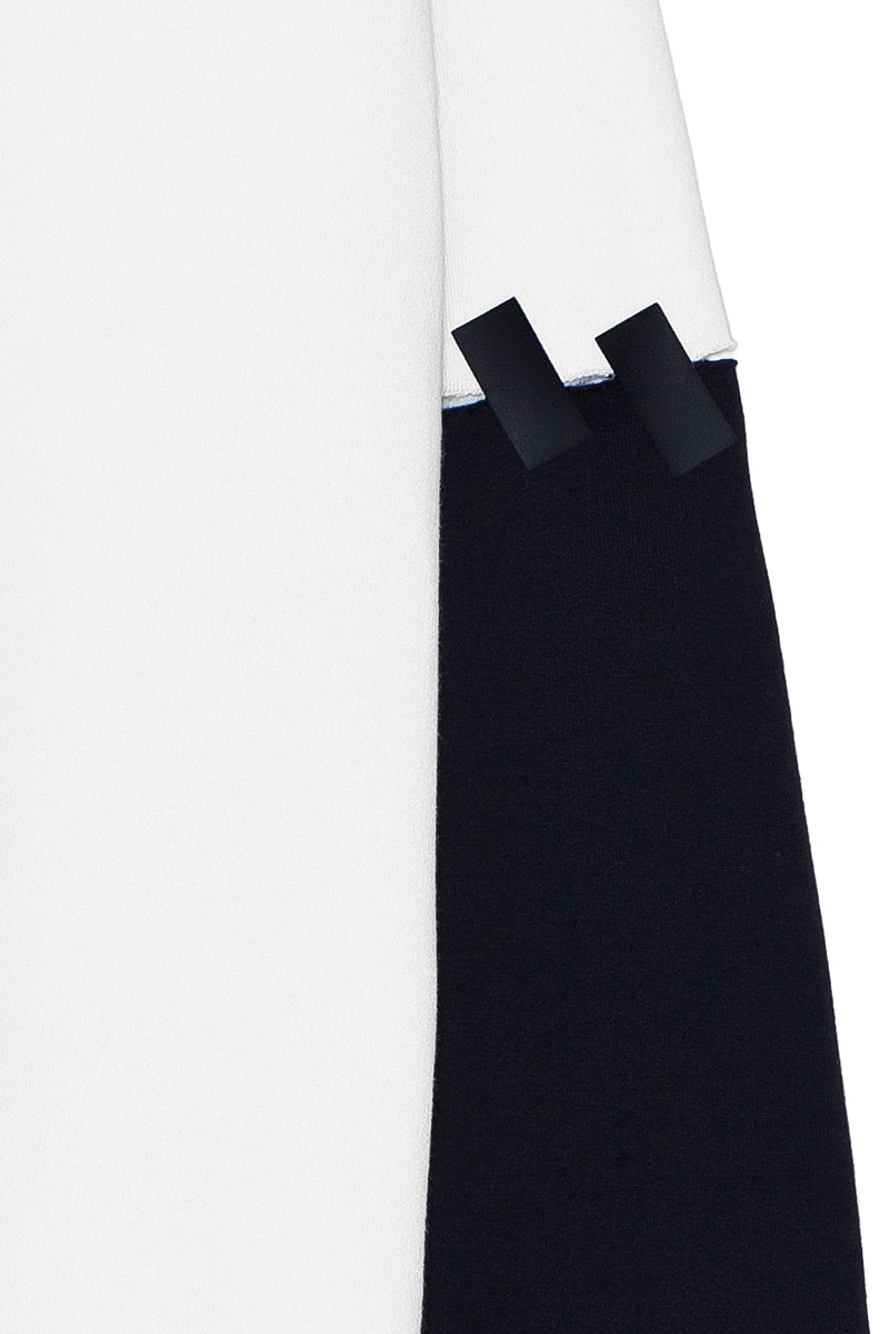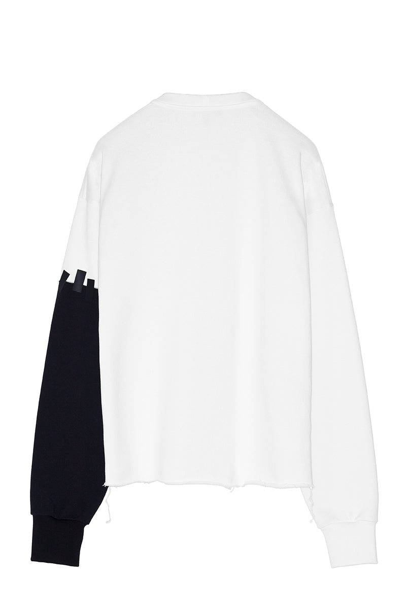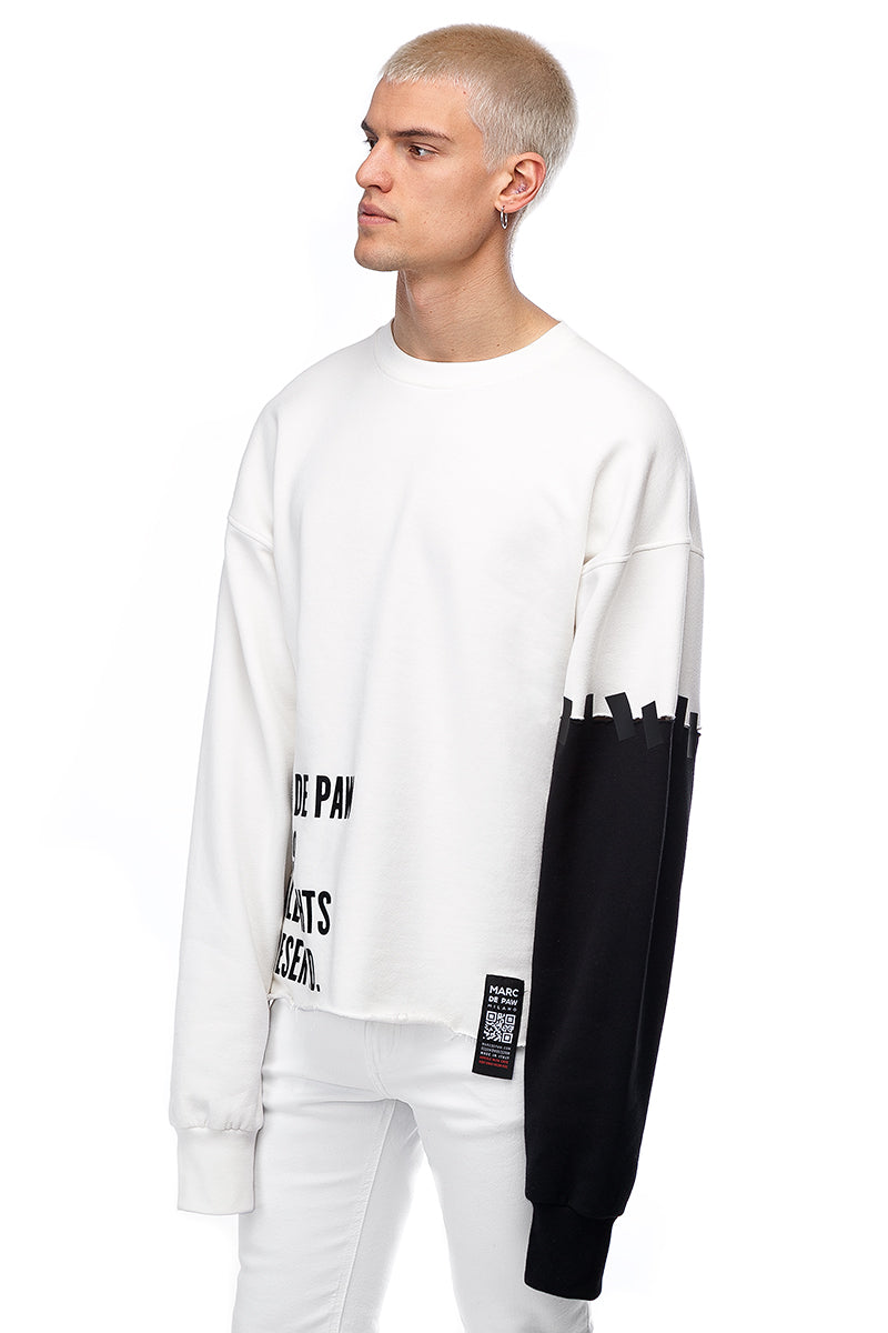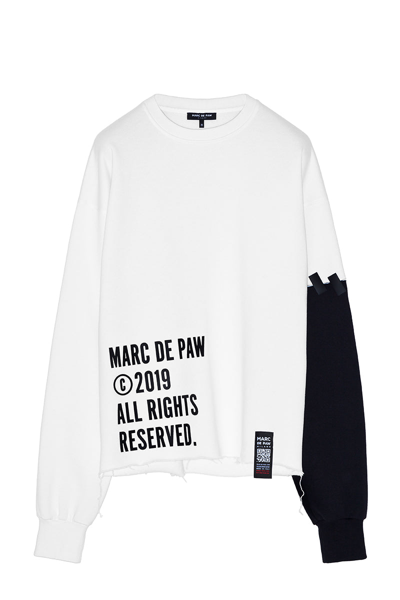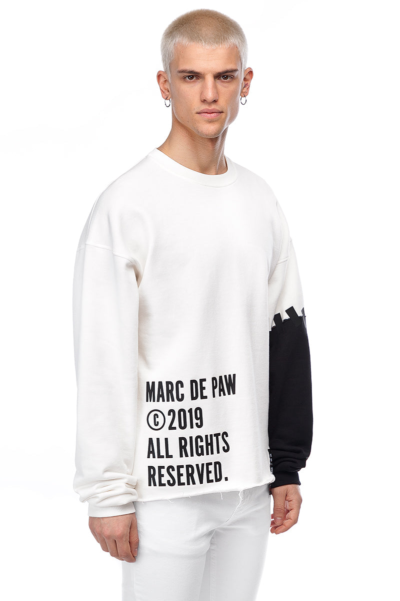 White cotton Sweatshirt with Copyright notice application at front and black contrast sleeve fixed with a special application.